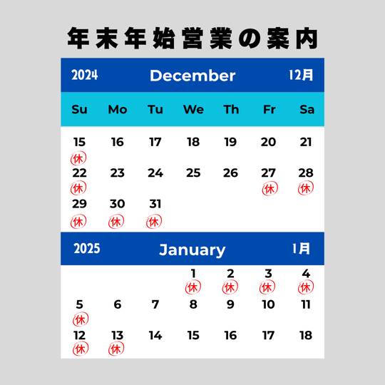 年末年始は、12/27~1/5までお休みさせていただきます。
