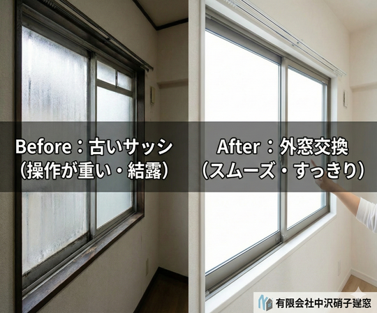 操作性が劇的に改善: 古くて重いサッシを新品にすることで、指一本で動くほどスムーズになります。