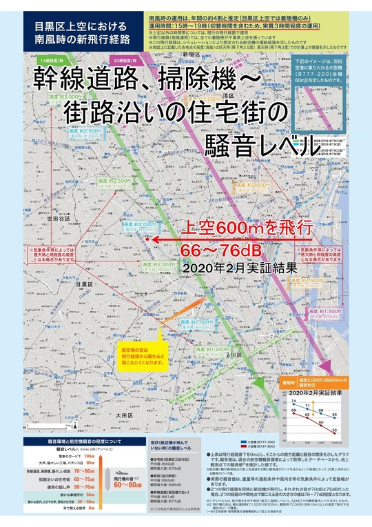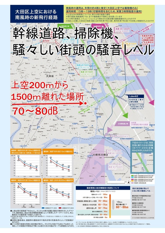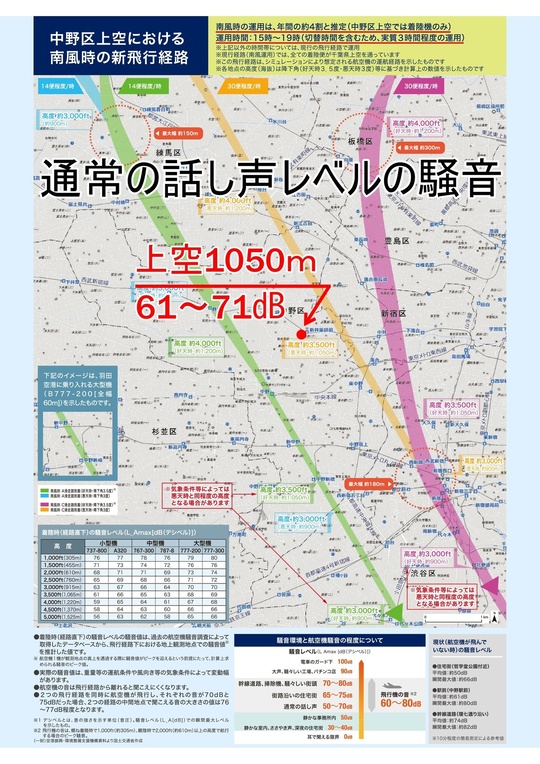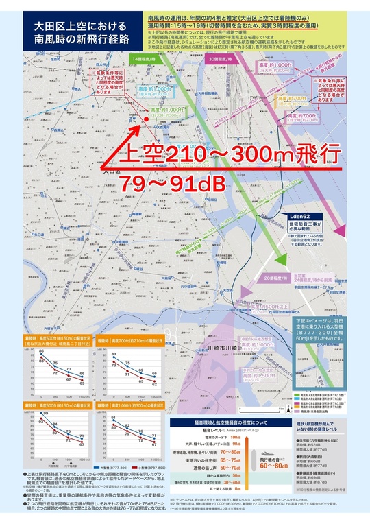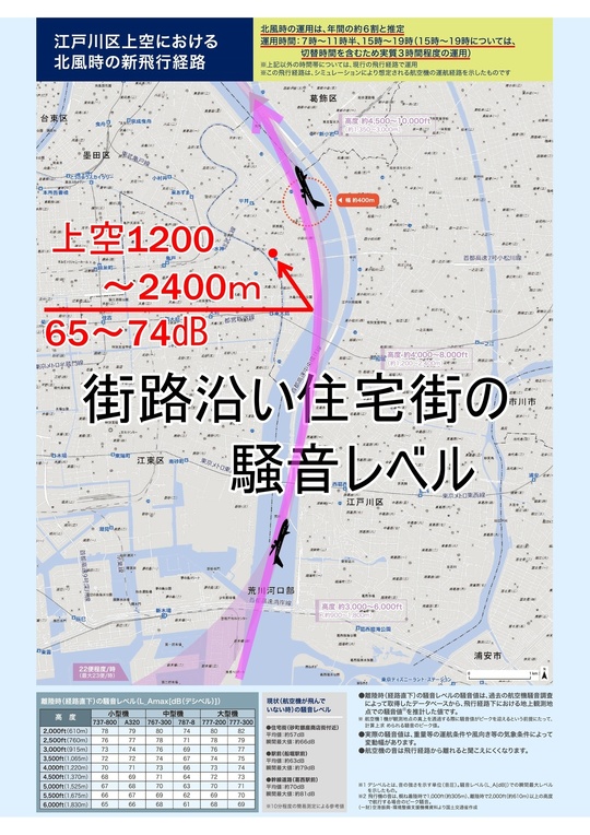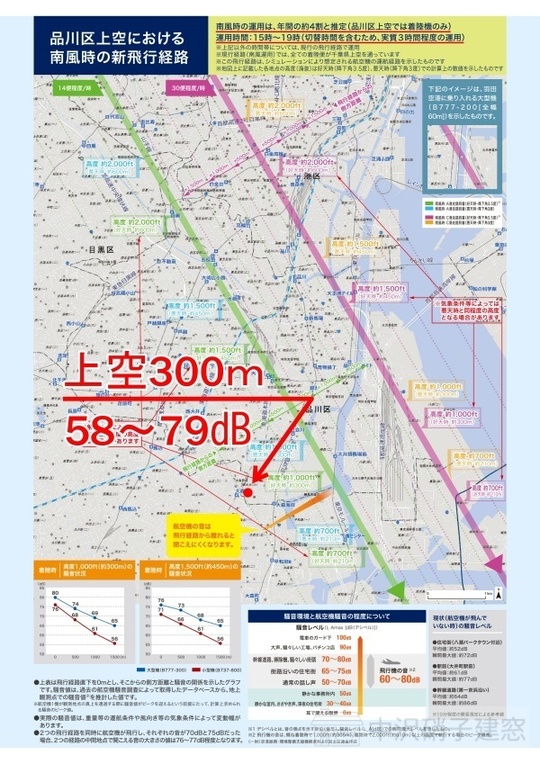 弊社は足立区です。運用試験の時に飛行機の窓が確認できる高さで飛行していたのを実際に見て近くて怖いと思いましたが、高度は1350~1500m。大森や川崎の一番低い場所では210~240mの高さで飛行するので、お住まいの方は、すごい騒音と飛行機の近さが怖いだろうなと思います。