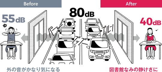 下記のイラストのように幹線道路沿いは80㏈の騒音といわれています。その沿線のご自宅の単板ガラス(一枚ガラス)を閉めた状態だと、室内は55㏈の音が聞こえる環境です。では、内窓を取付けるとなんと40㏈になり、図書館と同じ静けさの環境になります。なんと15㏈低減するんです。