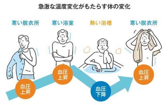 暖かいところから、急に寒いところへ行くと、血管が収縮して急激に血圧が上昇し、時として心臓発作や脳血管障害を引き起こしてしまいます。特に衣服を脱ぎ、熱いお湯に入る浴室では、その現象が起こりやすくなります。