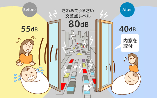 窓は音の出入り口。騒音によるストレスを解消して、静かな暮らしへ。 楽器の音やペットの鳴き声など室内から室外への音漏れ対策としてもおすすめです。