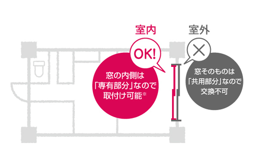 マンションは、個人がリフォームできる「専有部分」と管理組合が管理する「共用部分」に分かれています。内窓の施工箇所は「専有部分」に当たるのでマンションでもリフォーム可能です。ただし、マンションごとに管理組合の規約が違いますので、確認が必要です。