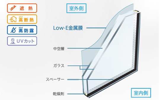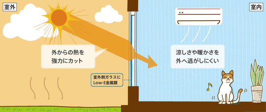 室内側ガラスをLow-E金属膜でコーティングし、熱の室内への流入や室外への流出を防止。冷暖効果を高めます。