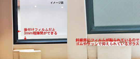 これらの方法だと、フィルムを窓ガラスより少し小さいサイズにして貼り付けるので、ガラスとサッシの間に隙間が3mm程開いてしまいます。