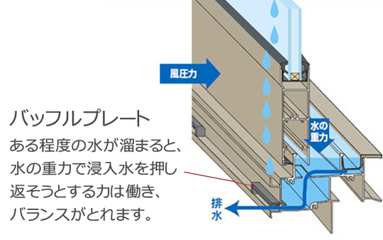 風が強い時は雨が少なくて、雨が多い時は風が弱かったのが、この数年は温暖化により、この説が成り立たなくなってきました。通常の引違い窓は、構造上になるのですが、下枠に雨水がたまることがあります。水密性能を保持するためで、不具合ではありません。