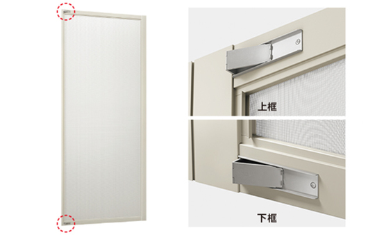 また、引違い窓用のスライド網戸には、強風による網戸の自走防止に配慮したストッパーも標準装備しています。