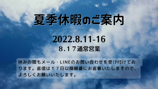 お休み中もLINE、メールでのお問い合わせお待ちしております。返信は17日の通常営業より順番にご連絡いたします。