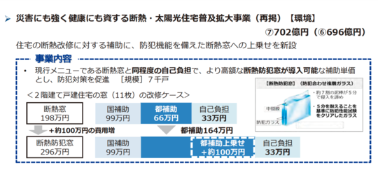 東京都の予算案を見ると防犯窓に変えると工事費用が高額になるので、実質の支払額が変わらないようにプラス100万円の補助額が上乗せされるイメージです。